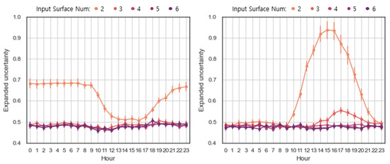 The uncertainty of MRT according to the number of input surfaces is classified into the winter and summer periods and investigated. Figure 12 shows the expanded uncertainty for winter (left) and summer (right) over 24 h a day. It shows that the time-dependent change of the summer uncertainty and the winter uncertainty is different in . is MRT calculated with two surface temperatures, and the input surface temperature is randomly selected from a group including only the window surface and a group including all other surfaces.