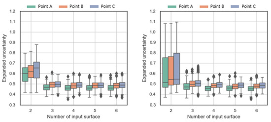 In the case of , the uncertainty shows a different trend depending on the weather conditions. Figure 13 shows the MRT uncertainty in winter (left) and summer (right) as boxplots according to the number of input surface temperatures. The deviation of the expected value is less than 0.1 °C, showing a slight difference, but the standard deviation of the uncertainty distribution in is relatively large in summer. The uncertainty of shows relatively greater fluctuations in summer than in winter. In the case of , the uncertainty expected value deviation between the two periods is less than 0.1 °C, showing little difference in uncertainty depending on the season.