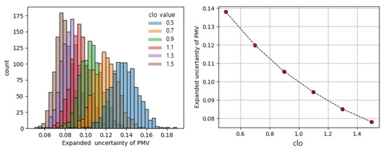 The uncertainty propagation of PMV shows different characteristics in summer and winter. The expected value of PMV uncertainty was 27–30% higher in summer than in winter. The main reason for the difference was the propagation of uncertainty according to the input clo, since PMV reflects the heat transfer between the occupant and the surrounding environment according to the clo value. As a result, the lower the clo value, the greater the effect of radiation and convection by the surrounding environment, so the uncertainty propagation of MRT becomes relatively large under the condition of wearing light clothing. Figure 15 is a graph showing the uncertainty of PMV propagated by MRT uncertainty by clo value. The PMV distributions are calculated using Monte Carlo simulations for six clothing conditions. It shows that the uncertainty of PMV decreases as the clo value increases.