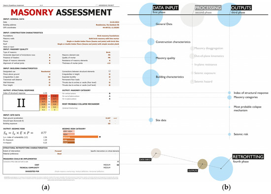 Adriseismic method: (a) assessment form, generated via a Microsoft Excel spreadsheet, showing input data and output (results), and (b) a diagram showing the main input categories (note that the processing phase is shown in grey).