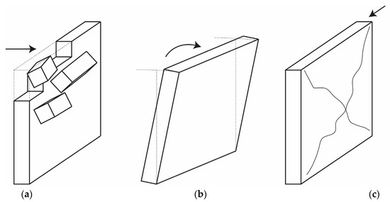 Disintegration concerns the loss of cohesion of the wall and is typical of loose (poorly cohesive) and weak (low strength) masonry, (Figure 3a). Out-of-plane kinematic mechanism, such as overturning (Figure 3b), can be simulated by a rigid macro-element, which does not depend on material strength characteristics. Collapse due to reaching the ultimate resistance in plane, also known as in-plane failure (Figure 3c), usually requires the greatest seismic energy and can be expected in cohesive masonry which is found in structures with well-connected load-bearing elements [43].