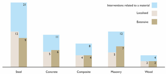 Figure 4 shows five main types of materials that can be used for interventions. The blue colour shows the total number of interventions for each material, while a beige bar gives an indication of the extent (extensive or localised). For each intervention, a few qualitative indications are available to help guide the choice. Based on the Adriseismic project deliverable D.T.2.1.2 [9], the cost, technical complexity, and critical issues are indicated, as seen in Table 7. For the Croatian scenario, the retrofitting prices were based on World Bank reports and Croatian methodology [47,48,49,50].