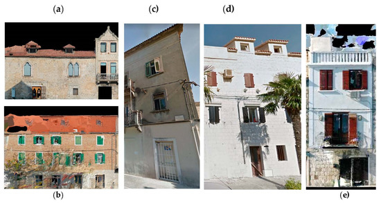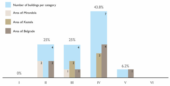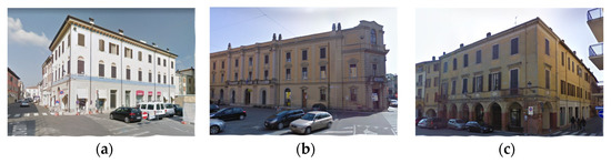 At the end of the development phase, the method was initially applied on real buildings. The aim was to verify the adaptability of the procedure in varied contexts and its compliance with the four guiding criteria illustrated in Section 2 (easily accessible information, quick assessment, outputs easily understandable, and international use). For this purpose, buildings in three different areas within three cities were studied: Mirandola (Italy), Kaštela (Croatia), and Belgrade (Serbia). The areas were selected according to Adriseismic project objectives; hence, URM buildings facing squares and having a historical identity for the place were considered.
