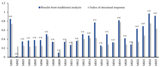 The output (results) was presented using the same quantitative indicators as the input. For example, the parameter “index of structural response” is defined by six different classes (I to VI), where I indicates a highly vulnerable building and VI indicates a building without obvious structural deficiencies. The class of a building was assigned based on the numerical value (ranging from 0 to 1), which describes the structural behaviour and directly depends on the inputs. The ranges shown in Table 2 were assigned considering wider ranges for the lower classes and narrower ranges for the higher ones; this increases the probability of assigning precautionary values.
