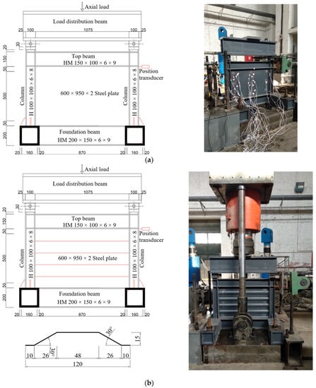 The four specimens are one-storey walls. The height of the specimens is 0.75 m, and the width is 1.1 m. The length between the axes of the columns is 1 m. The parameters of the four structural models are shown in Figure 1. Specimens A and C, shown in Figure 1a, were built up with flat steel plates, and specimens B and D, shown in Figure 1b, were built up with corrugated steel plates. The angle of corrugation in the trapezoidal plate is 30°, the depth of corrugation in the corrugated SPSW is 15 mm, and the width of the horizontal panel in the trapezoidal plate is 48 mm. The plates are made of Q235 steel and have a thickness of 2 mm. The dimension of the infill panel was 600 mm × 950 mm. The design parameters of the four structural models are exhibited in Table 1. The columns and beams of the frame are H sections made of Q390 steel. For the columns, the H-overall depth (d) of H-section steel was 100 mm, the flange width (bf) of H-section steel was 100 mm, the web thickness (tw) of H-section steel was 6 mm, and the flange thickness (tf) of H-section steel was 8 mm. For the top beam, the H-overall depth (d) of H-section steel was 150 mm, the flange width (bf) of H-section steel was 100 mm, the web thickness (tw) of H-section steel was 6 mm, and the flange thickness (tf) of H-section steel was 9 mm. This top beam was stiff to ensure the load smoothly transferred to the tension zone that appeared under the beam. The beam-to-column joints are all moment connections.