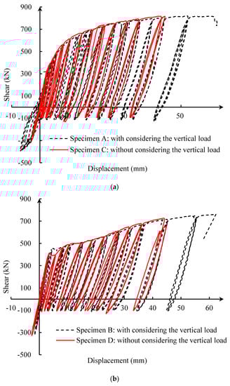Hysteretic curves of specimens with and without the vertical load: (a) flat wall and (b) corrugated wall. (Adapted with permission from Ref. []. Copyright 2022 Springer Nature).