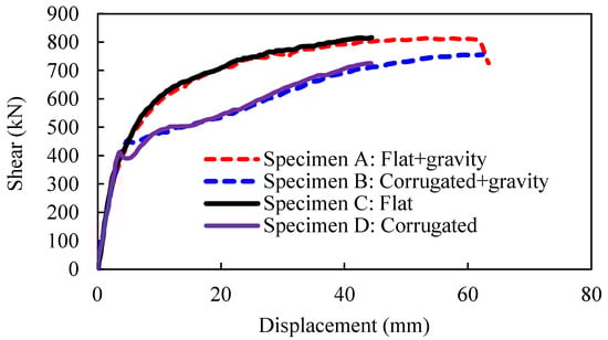 Figure 3 shows the envelope curves of the four SPSWs with different infill steel panels under different loadings. It found that a yield plateau can be observed in the envelope curve of the corrugated SPSW. The results are shown in Table 3, including the stiffness, strength, the corresponding deformation at the yielding strength and the ultimate strength, and so on. For the flat SPSW with the vertical load (specimen A), the yielding displacement was 6.75 mm, the yield force was 507.8 kN, and the corresponding yield inter-story drift was 1.038%. For the corrugated SPSW with the vertical load (specimen B), the yield displacement was 4.79 mm, the yield force was 453.06 kN, and the corresponding yield inter-story drift was 0.737%. The yield displacement of the flat SPSW without the vertical load (specimen C) is 6.58 mm, the yield force is 520.5 kN, and the corresponding yield inter-story drift was 1.012%. For the corrugated SPSW without loading in the vertical direction (specimen D), the yield force was 412.4 kN, the corresponding displacement of the yielding point was 3.51 mm, and the corresponding yield inter-story drift was 0.54%. Before the infill plate of the SPSW buckling, the stiffness and the shear strength of the horizontal CSPSW were almost the same as the flat SPSW. The shear displacement remained a linear increase versus the applied shear force. After the infill plate of the SPSW buckling, the shear strength of the horizontal CSPSW was less than the flat SPSW. A small yield plateau can be observed in the shear–displacement curve of the horizontal CSPSW. The plateau is caused by the gradual flattening of corrugations. The corrugations of horizontal CSPSWs can increase the deformation adaptability. With the increase in displacement, the shear force increased and the tension field of the horizontal CSPSW was developed until the test finished.
