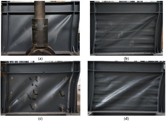 Taking specimen A (the SPSW with flat panel) as an example, the buckling of the flat panel did not occur when the top displacement was 4 mm. The tension field strips may be formed, which were inclined, and the inclination angle of the strips was about 45°, as shown in Figure 4a. When the lateral load reached 300 kN for the first time, the specimen produced a loud bang. In the following cycles, the specimen would continue to make loud bangs. As the top displacement increased, the infill steel plate gradually began to yield. At the end of each cycle, the specimen had a large residual deformation. With the increase in loading cycle number, the residual deformation increased. There were no cracks formed during the whole test. The ultimate deformation of the flat SPSW was large than 62 mm, whereas the shear bearing capacity of the flat SPSW was reduced by about 15%. When the test finished, local buckling may be formed in the flange of the compression column, and there was only a slight out-of-plane deformation formed in the flat SPSW.