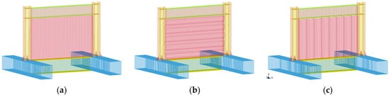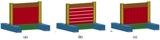 FEM of the walls with (a) flat, (b) horizontal corrugated, and (c) vertical corrugated steel plate.