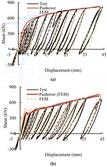 Figure 8 shows the simulation results of specimens C and D. Figure 8a is the simulation results of the flat SPSW (specimen C), and Figure 8b is the simulation results of the horizontal corrugated SPSW (specimen D). The pushover curves of specimens C and D, obtained by the FEM analysis, are also exhibited in Figure 8. It was found that the hysteresis curves of the test were consistent with those of the simulation results. The shear strengths of the SPSWs obtained from the pushover curve were a little higher than those of the experimental and numerical simulation results.