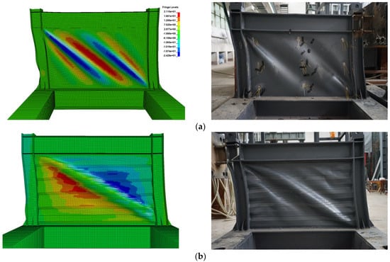 Figure 9a shows the failure mode of the flat SPSW (specimen C), and Figure 9b shows the failure mode of the horizontal corrugated SPSW (specimen D). Comparing the failure mode of numerical simulation with that of the test, the finite element model may efficiently simulate the behavior of the steel plate shear walls. So, the finite element model may be verified by the experimental test and can be utilized to predicate the behavior of the SPSWs with different infill panels.