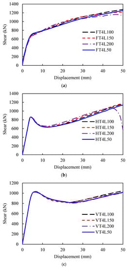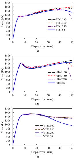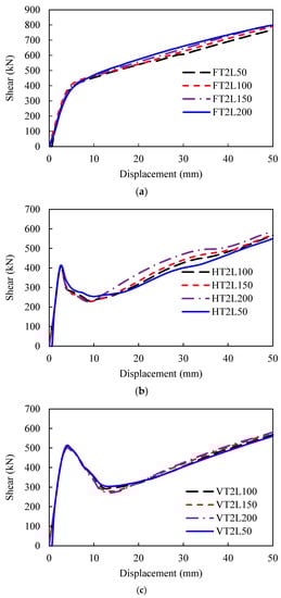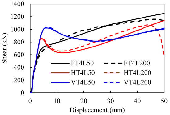 For the SPSWs with a thickness of 6 mm (the corresponding height-to-thickness ratio is 100) under different axial stress, the relationship between shear and displacement is shown in Figure 11. For the SPSWs with a thickness of 4 mm (the corresponding height-to-thickness ratio is 150) under different axial stress, the relationship between shear and displacement is shown in Figure 12. For the SPSWs with a thickness of 2 mm (the corresponding height-to-thickness ratio is 200) under different axial stress, the relationship between shear and displacement is shown in Figure 13. The shear strength of SPSWs with different types and thicknesses of infill plates under different vertical loads are listed in Table 5. The results demonstrated that the impact of the gravity load on a thick SPSW was larger than that of a thin SPSW. As shown in Table 5, for the flat SPSW with a thickness of 6 mm (FT6), when the axial stress increased from 50 MPa to 100 MPa, the shear strength decreased by about 0.52%. When the axial stress varied from 100 MPa to 150 MPa, the shear strength decreased by about 1.57%. When the axial stress varied from 150 MPa to 200 MPa, the shear strength decreased by about 2.96%. For the horizontal CSPSW with a thickness of 2 mm (HT2), when the axial stress caused by loading vertically increased from 50 MPa to 100 MPa, the shear strength of HT2 decreased by about 0.57%. When the axial stress increased from 100 MPa to 150 MPa, the shear strength of HT2 decreased by about 1.48%. When the axial stress increased from 150 MPa to 200 MPa, the shear strength of HT2 decreased by 2.34%. For the vertical CSPSW with a thickness of 4 mm (VT4), there was almost no difference in shear strength with the increase in axial stress.