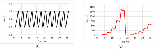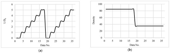 Figure 1 depicts the variations of 36 values for all four parameters. In Figure 1a, six values of 0, 1, 2, …, and 5 (each having a frequency of 6) are seen for the L/Db. Figure 1b reports the presence of two soil categories, i.e., dense and loose soils, signified by DC values equal to 85 and 35, respectively. As for the Db/Ds, three values of 0.3, 0.4, and 0.5 are repeated 12 times in Figure 1c. As Figure 1d displays, the Pul values are fluctuating in an irregular pattern. For this parameter, the statistical indicators of mean, standard deviation, sample variance, minimum, and maximum equal 376.86, 465.09, 216,316.33, 0, and 1622.47, respectively.