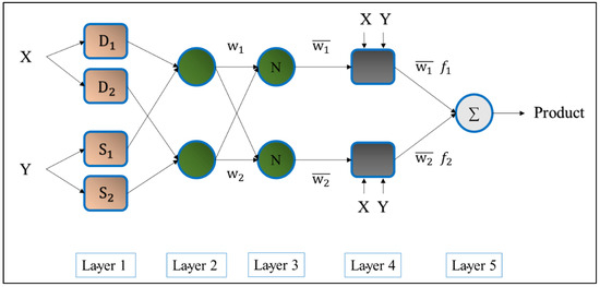 Figure 2 depicts the configuration of a standard ANFIS, mapping the output Z from the inputs X and Y through five layers. Given that and are the fuzzy sets and , , and are the output parameters, the below if–then regulations can be written as follows: