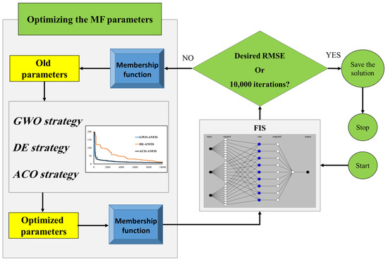 Figure 3 displays an optimization procedure where the optimal configuration of the ANFIS is discovered by the GWO, DE, and ACO metaheuristic search methods. A new FIS is created in each iteration using the found solution. The quality of this solution is reflected by measuring the accuracy of the developed FIS. This process is detailed in the sections below.