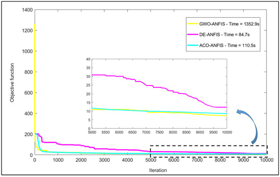 Although DE-ANFIS was considered more accurate than the two other methods, referring to Figure 4, this algorithm requires a much larger number of iterations to reach a suitable accuracy. Hence, the use of ACO and GWO may be preferred for time-sensitive applications, as these algorithms could reach a desirable accuracy with around 1000 iterations.