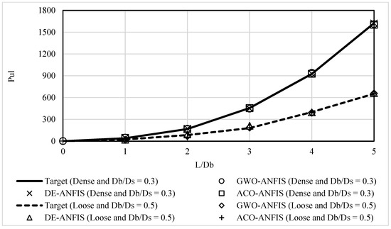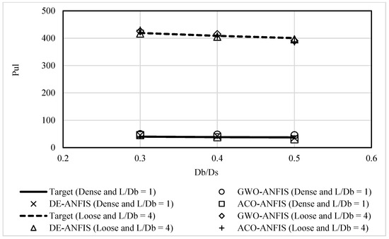 Similarly, Figure 9 plots the Pul versus L/Db, where Db/Ds equals 0.3 (for dense soils) and 0.5 (for loose soils). As is obvious, the increasing trends of the target parameter have been correctly simulated by the applied models for both loose and dense soils.