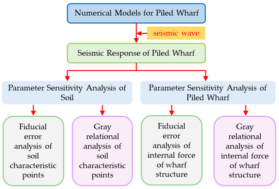 This paper conducts a sensitivity analysis of the piled wharf structure, in order to provide design guidance for practical engineering. The flowchart of the parameter sensitivity analysis is shown in Figure 1. Firstly, a numerical model of a foundational soil-piled wharf structure interaction system was established. Then, the grey correlation analysis and fiducial error analysis methods were utilized to consider the influence of multiple variables on the seismic response of the piled wharf. The sequence of parameter sensitivity was also obtained, with the most sensitive variable identified. The presented parameter sensitivity analysis procedure can provide a reference for the seismic design of piled wharf structures, as well as for disaster prevention prediction.