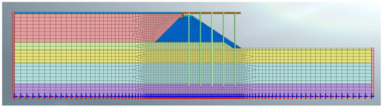 The geometrical dimensions of the 2-D model (Figure 2) are 170 × 45 m established in Midas GTS NX. The numerical analyses were performed with five piles, whose length is 30.5 m and whose diameter is equal to 0.6 m. The pile spacing is 5.5 m. In this, the nonlinear dynamic response of the pile concrete material is given primary consideration; the Druker–Prager constitutive is selected as the pile material [34,35,36,37,38].