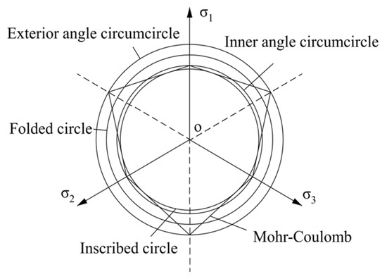 Multiple positional interrelationships (Figure 4) between the Drucker-Prager yield curve and the Mohr-Coulomb yield curve are shown in the bias plane. In this paper, the circumcircle principle is used, and the positional relationship according to the M-C criterion and the D-P criterion yields: