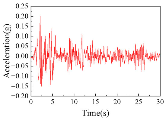 Free-field boundaries are attributed to the vertical faces and bottom face fixed constraint of the numerical model. Assume the complete coupling of grid nodes between pile-soil units to answer pile-soil interaction problems. Seismic acceleration excitation of the soil and piled wharf structure from the bedrock surface eliminates traveling wave effect. The amplitude of the El-Centro wave was tuned to 0.05 g, 0.1 g, and 0.2 g for excitation of the numerical model. The time history of the El-Centro wave is shown in Figure 5.