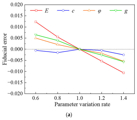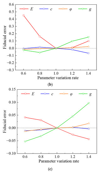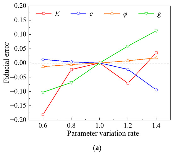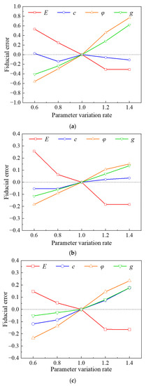 According to the constitutive relation of the Druker-Prager principal and the relevant indices of seismic intensity, the sensitivity parameters of the soil are selected as cohesion, friction angle, elastic model, and ground motion intensity; afterward, the parameter matrix is established, as shown in Equation (6):
