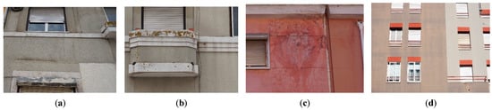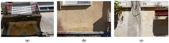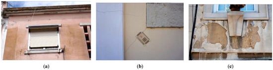 Oriented cracking can be caused by thermal-induced movements that affect the building in general or just some structure elements (e.g., terrace slab) and differential responsive movements of the façade’s components [57,61]. Temperature and damp level changes lead to dimensional variations and stresses of a hygrothermal nature between different materials, which promote cracking [4,55]. This is observed when cracks follow the joints between the various elements of the substrate if it is heterogeneous (e.g., concrete, bricks and mortar). The incompatibility of Young’s modulus and the coefficient of thermal expansion between render and substrate negatively influences cracking [57]. If the deformation ability of the render is not enough to accommodate interfacial tensions between the render and adjacent building components (e.g., substrate), cracking occurs [40].