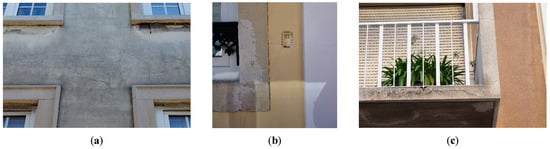 The render’s loss of performance generally starts with staining and cracking degradation mechanisms and evolves to loss of cohesion and adhesion defects, until severe conditions are reached (Figure 1) [18,51]. The degradation of exterior renders usually begins at a young age [18], sometimes prematurely (e.g., cracking by shrinkage), probably as a consequence of (i) inadequate environmental exposure conditions during the application and curing process and/or (ii) design or execution errors. This could affect the performance of renders early on and their expected functionality in terms of preventing water penetration, protecting external walls and promoting the durability of constructions [16].