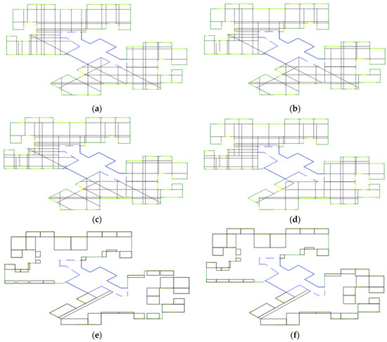 Procedures to create room seeds: (a) create partition planes; (b) shorten those planes that touch windows; (c) correct unconnected partition planes; (d) delete non-orthogonal sections; (e) select room cells along boundaries; (f) adjust cell sizes to local environments (Dark green lines: unit boundaries; light green lines and yellow lines: openings; grey lines: partition planes).