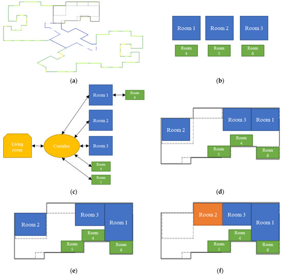 Grammar approach to creating the room configuration that satisfies the topological relations: (a) 2D cell complex of a unit; (b) prepare room rectangles; (c) define room’s topological relations; (d) place room rectangles into room seeds; (e) refine room configuration; (f) find the optimum configuration by pair-wisely exchanging.