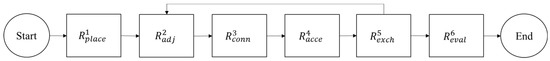 The exchange rule performs the CRAFT procedure where it exchanges the locations of two room rectangles or moves the location of a room rectangle to another empty seed. In the rule, the term denotes that seed is assigned by rectangle . A seed may or may not have a rectangle on it. If is not assigned, is set to zero. Because rectangles of the same room type are the same, we do not need to exchange the locations of the rectangles belonging to the same type. Therefore, we only need to relocate the rectangle to an empty seed.
