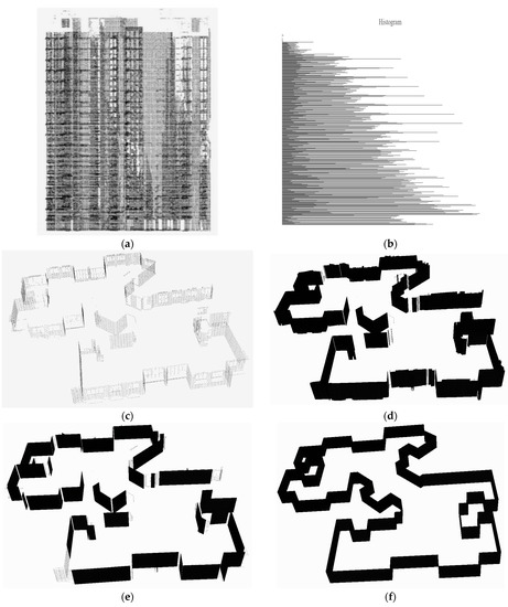 The building’s exterior walls, the hallway systems, and the ground floor can be scanned separately with a focus placed on the boundary lines of walls and openings (i.e., doors and windows). They are then treated as independent sets of point clouds. The workflow begins with the registration of multiple point clouds of the object that are acquired from different viewpoints. The registration process can be performed by using either artificial targets or objects’ features (e.g., edges or corners of walls). In practice, the registration process is performed by using the scanner’s proprietary software such as Faro® Scene Software (https://www.faro.com/zh-CN/Products/Software/SCENE-Software accessed on 21 November 2022). Because the resulting registration includes a large number of redundant points, we eliminate them using the segmentation method proposed by Vo et al. [19]. After that, the data points are projected onto horizontal and vertical planes. The data points are firstly vertically sliced according to the standard floor-to-floor heights into many blocks. Each block is projected horizontally and vertically into various planes.