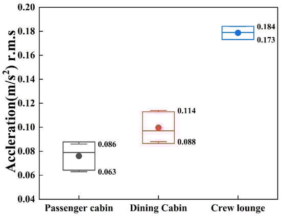 Equivalent continuous A-weighted noise pressure levels (LAeq) are shown in Table 4, which presents an increasing trend from the passenger cabin to the crew lounge in ratios calculated by fitting the measured value to the maximum acceptable pressure level []. The modal behavior of rooms and plates may be the reason for the variation in noise and vibration in each cabin. The passenger cabin and dining cabin are located in the middle of the vertical direction, and the dining cabin is at the rear of the passenger cabin; in other words, it is at the stern of a ship. In the passenger cabin, the environment is relatively quiet, and the vibration and noise collection levels are relatively low. In the dining cabin, the test time was mealtime. Factors such as personnel walking and chatting, as well as the kitchen hood and other equipment, made the dining cabin environment noisy, but they were distracted by communication and meals. The lounge is located at the lower hold, adjacent to the air-conditioned and equipment rooms and bears the strongest vibration from the waves and the machine.