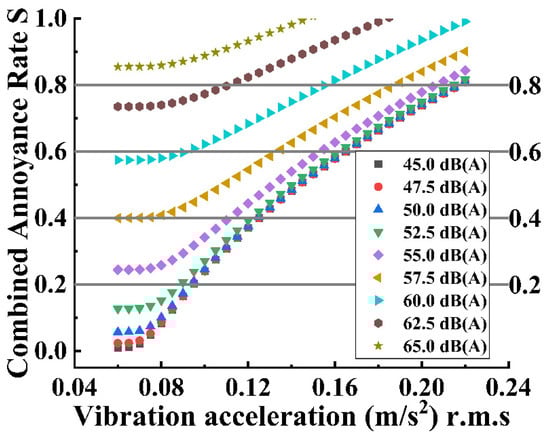Ke S and Wei Z [] proposed a root-mean-square equation to evaluate the combined effect of noise and vibration. The annoyance rate varied from 0 to 1, and if S exceeded one, then set S equals to one. The regression equation is as follows.