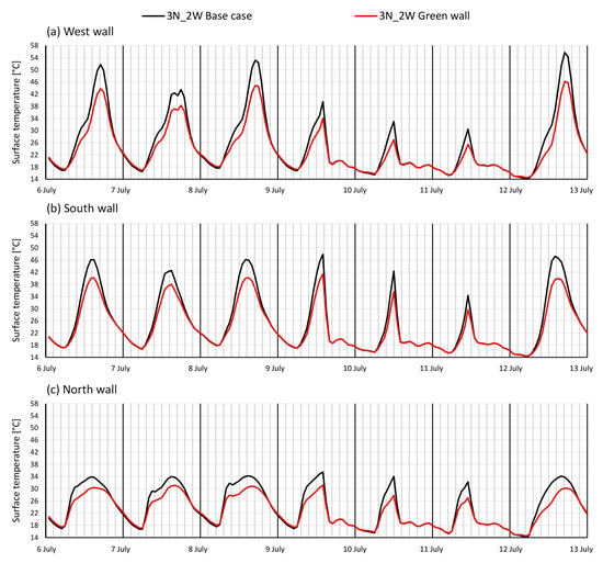 Considering the reference building’s actual configuration (3N_2W), the graph in Figure 2 shows the trend of the external surface temperature for the western, southern and northern walls; a comparison between the green retrofit layout and the base case is provided considering the summer reference week. As clearly shown in the results, the green wall installed on the west-oriented façade led to the most significant reduction of external surface temperature. Even if the latter was influenced by natural fluctuations of external air temperature and solar radiation, a maximum decrease of about 8 °C was assessed. On the other days, temperature reduction was less evident but still appreciable with an average value of about 6 °C. Regarding the southern and northern walls, the reduction was less significant and equal to an average of 5 °C and 4 °C, respectively. This remarkable decrease in external surface temperature is related to the green walls’ ability to shade the building from incident solar radiation during the day.
