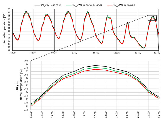Focusing on indoor conditions, Figure 4 shows the variation of indoor air temperature still considering the summer design week. In this case, the graph illustrates a comparison between the base case and the vertical greenery adoption configurations, considering two different tested layouts for the latter: total green coverage, and green vertical bands excluding windows. The layout with the highest greenery surface produced the most sensible reduction of internal air temperature. As reported in the highlighted section of the graph, a reduction of about 0.6 °C during the daytime was achieved in this case (3N_2W Green wall). The alternative configuration (3N_2W Green wall-Bands) ensured a decrease of roughly half that value. Such a difference is symptomatic of the relevance of the heat gains provided by the windows: the effectiveness of installing green walls was highly affected, excluding glazed portions.