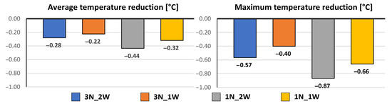 Considering the configuration with vertical greenery installed on the whole external wall surface, the analysis of the indoor air temperature was refined with reference to variations in building layout and numbers of windows. The results are reported in Figure 5. The maximum decrease registered was equal to 0.87 °C for the 1N_2W configuration. Even if both building geometry and percentage of windows were influential factors, the second one affected the analysis to a lesser extent, producing variations of about 0.2 °C.