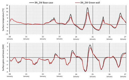 Simulations were also performed to investigate winter performance considering the winter reference week already indicated. The main results are summarized in Figure 6, where the trend of the external surface temperature and surface heat gains and losses are shown. A reduction of the wall’s external surface temperature in a range between 4 °C and 6 °C with the installation of the indirect green wall occurred during days characterized by higher external temperatures and incoming sun radiation. In addition, it is interesting to note that during nighttime, an increase in the external surface temperature with vertical greenery of about 0.5 °C was registered with positive effects in terms of heat loss reduction.