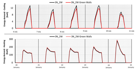 As Figure 7 shows, the trend of energy consumption for both configurations (3N_2W and 3N_2W Green Walls) was the same for both the summer and winter reference weeks. It is worth noting that the reduction in cooling consumption due to the installation of vertical greenery was more appreciable, accounting for an average of 2 kWh during the considered week and for the vertical greenery layout. Moreover, during the winter reference week, the use of green walls resulted in a slight increase in heating energy demand (~4%), which is mainly due to the shadowing effect of vegetation.