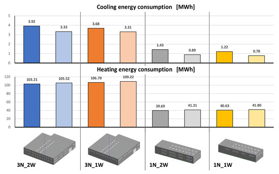 Figure 8 illustrates the yearly energy consumption for the case study for both cooling and heating. Vertical greenery installation mostly influenced energy performance during the summer months; a considerable reduction of about 600 kWh occurred for both analyzed geometries (3N and 1N) during the summer. In this regard, it is worth noting that for smaller buildings, higher energy savings were achieved. The assessed decrease was about 38%, compared with decreases of 14% and 9% registered for the 3N_2W and 3N_1W configurations, respectively. During the winter season, green walls had a detrimental effect, leading to a slight rise (2%) in building energy needs, even if to a lesser extent with respect to the energy savings over the summer season.