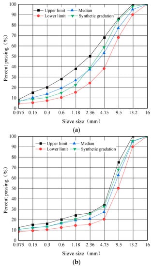 Three typical mixtures, AC-13, SMA-13, and SUP-13, were adopted. The gradation curves are illustrated in Figure 3, respectively. The AC-13 and SMA-13 gradation design processes were conducted following the procedures listed in the JTG F40-2004 [], while SUP-13 gradation design process was in accordance with the Superpave design method.