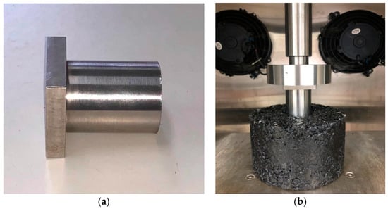According to JTG D50-2017 [], a cylindrical specimen with a height of 100 mm and a diameter of 150 mm was used for the uniaxial penetration test. A loading bar with a height of 50 mm and a diameter of 42 mm was used. The test temperature was set at 60 °C. The schematic diagram of this test is shown in Figure 4b. The penetration stress (σP), penetration strength (RT), and penetration modulus (ES), calculated by Equations (2)–(4), were used to assess the high-temperature deformation resistance of mixtures.