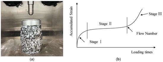 Dynamic creep test illustration: (a) Dynamic creep test process; (b) Illustration of three stages.