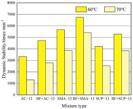The results of dynamic stability from the wheel tracking test are shown in Figure 6. Figure 6 revealed that the dynamic stability values of all the asphalt mixtures decreased significantly at the higher test temperature of 70 °C, no matter whether basalt fiber was added or not. For instance, the DS values of AC-13 declined sharply from 3336 times/mm to 1308 times/mm by 60.8%, while SMA-13 and SUP-13 decreased from 5673 times/mm to 3859 times/mm by 32.0%, and from 4215 times/mm to 2537 times/mm by 39.8%, respectively. Compared with the neat asphalt mixtures, the dynamic stability values of AC-13, SMA-13, and SUP-13 increased by 41.5%, 19.1%, and 25.4% at the test temperature of 60 °C, respectively, while increased by 113.0%, 40.2%, and 51.4%, respectively, at 70 °C. This phenomenon indicates that adding basalt fiber into asphalt mixtures can improve the high-temperature rutting resistance effectively, and the strengthening effect is more significant at a higher temperature. This is due to the fact that the three-dimensional spatial distribution of basalt fiber can restrict the movement of aggregates []. Furthermore, in terms of the asphalt types, the DS value of AC-13 presented the highest increasing rate when adding basalt fiber. The reason may be that the original DS value of the neat sample AC-13 is small, so the percentage of improvement is relatively more obvious after the addition of basalt fiber.