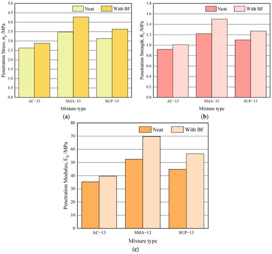 Figure 7 illustrates the results from the uniaxial penetration test. It could be found from Figure 7 that basalt fiber improved the shear stress resistance of asphalt mixtures effectively. And compared with neat asphalt mixtures, the penetration stress values of AC-13, SMA-13, and SUP-13 with basalt fiber increased from 2.63 MPa to 2.88 MPa by 9.5%, 3.48 MPa to 4.28 MPa by 23.0%, and 3.13 MPa to 3.63 MPa by 16.0%, while penetration strength values increased by 9.8%, 23.0%, and 15.5%, and penetration modulus values increased by 12.2%, 32.8%, and 26.3%, respectively. In addition, in terms of the asphalt types, it is noteworthy that SMA-13 with basalt fiber not only showed the best penetration strength but also presented the highest increasing rate. This is due to the fact that SMA gradation possesses a skeleton dense structure, and a three-dimensional network structure was formed by basalt fibers in asphalt mixtures, which controls binder drain down and improves the resistance to rutting [].