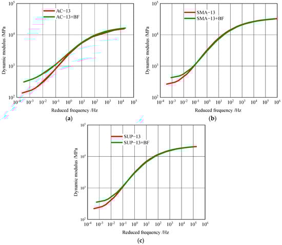 The dynamic modulus master curves of the six types of asphalt mixtures are illustrated in Figure 8. As seen from Figure 8, in the higher frequency section (corresponding to the low-temperature section), the dynamic modulus values of the same graded asphalt mixtures were relatively close, regardless of whether basalt fiber was added or not. However, significant differences in the dynamic modulus values could be observed in the lower frequency section (corresponding to the high-temperature section). The dynamic modulus values of asphalt mixtures with basalt fiber were much higher than that of neat asphalt mixtures without basalt fiber. Taking AC-13, for example, as shown in Figure 8a, at the reduced frequency of 10−3 Hz, the dynamic modulus values with basalt fiber increased from 162.44 MPa to 358.41 MPa by 120.64%, compared with neat asphalt mixtures. It indicates that the addition of basalt fiber into asphalt mixtures can reduce not only the temperature sensitivity but also enhance the elastic recovery ability, which helps increase the high-temperature stability. This result may be attributed to the formation of a basalt fiber network in the mixtures, which plays a positive role in the reinforcement of the high-temperature deformation []. Moreover, another possible reason could be that the basalt fibers can absorb free asphalt and increase the number of structural asphalts [].