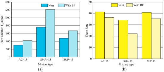 The flow number and creep rate values from the dynamic creep test are presented in Figure 9. It could be observed that adding BF could positively enhance the dynamic creep resistance of asphalt mixtures. For instance, compared with neat asphalt mixtures, the flow number values of AC-13, SMA-13, and SUP-13 with basalt fiber increased by 39.1%, 59.2%, and 39.7%, respectively, while the creep rate values decreased by 12.0%, 35.2%, and 12.7%, respectively. It indicates that BF can efficiently delay the accumulated permanent deformation rate of asphalt mixtures. Furthermore, the enhancement effect of basalt fiber on SMA-13 was more significant than the other two types of mixtures, which is consistent with Mu’s and Jomoor’s [,] research results that SMA-13 bears a longer time to reach the Stage Ⅲ of failure than AC-13 and SUP-13 due to its skeleton structure.
