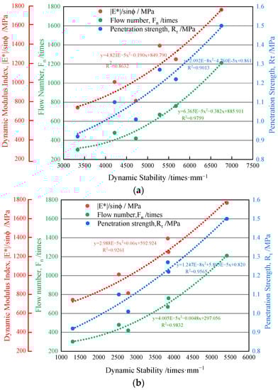 - Approximate binomial relationships can be established between dynamic stability and penetration strength, dynamic stability and dynamic modulus index, and dynamic stability and flow number. Higher correlation coefficients can be obtained when DS values from 70 °C are used.