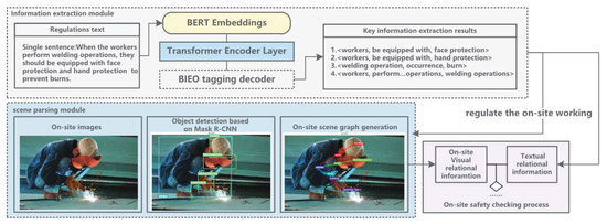 The IE module can automatically extract the key information from the regulations. In addition, detecting the visual relations and parsing the on-site scene is necessary for additional research on automatic hazard inspections. The (SPO) relational triples can also express visual relations. An on-site scene graph has the perceptual capacity to recognize the position, class, and interrelationship of entities. The visual relations between entities could be action-based, comparative, or spatial. As shown in Figure 4, the on-site scene parsing module extracts visual and semantic features for each visual relationship proposal.