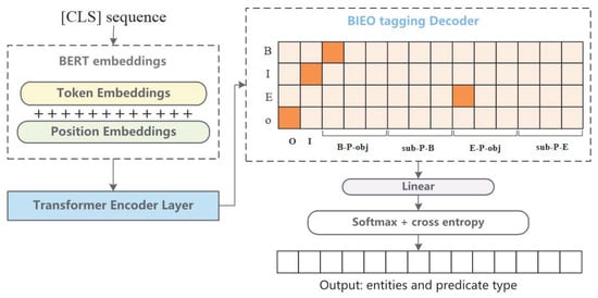 Relation extraction is a core task in IE, and its goal is to detect specific types of entities and the relations between entity pairs from unstructured natural language text. It is essential for ontology learning and building knowledge bases [41]. Our proposed IE enables the extraction of multiple relational triples. A relational triple contains a subject entity (S), an object entity (O), and a semantic relation R between entities. A triple is often formalized as . For example, <worker, wear, helmet>. As Figure 2 shows, the proposed model comprises a BERT-based encoding layer and a BIEO tagging decoder.